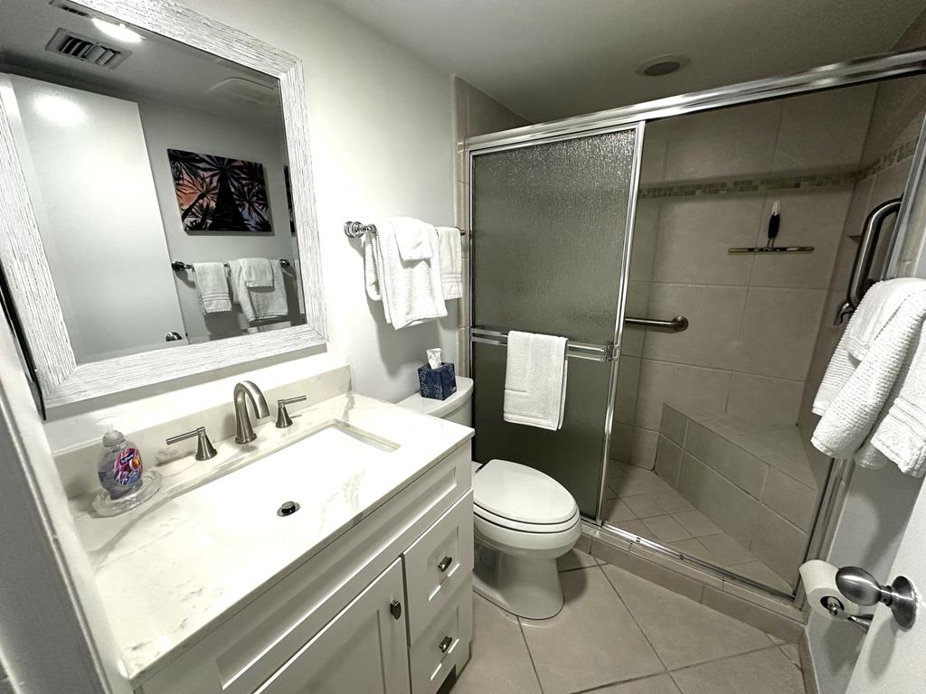 Nice kitchen with new appliances and spacious walk-in shower in the bathroom.