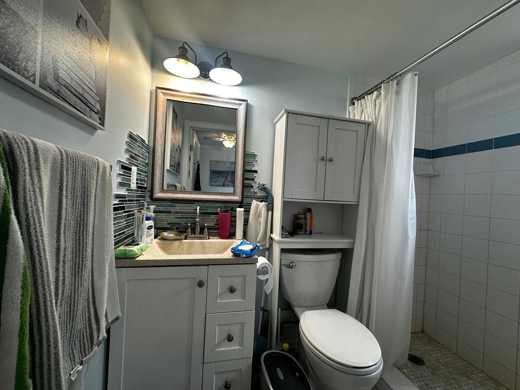 Separate bedroom has a queen size bed, room darkening shades and the en-suite has a tile shower, glass backsplash, white vanity with solid sink.